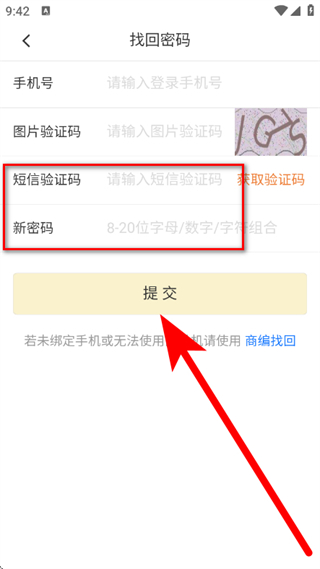 3、输入短信验证码、新密码后,点击提交,完成密码重置。