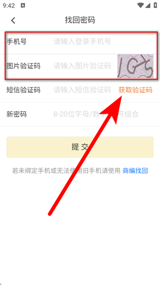 2、在找回密码页面,输入手机号、图片验证码,点击获取验证码。