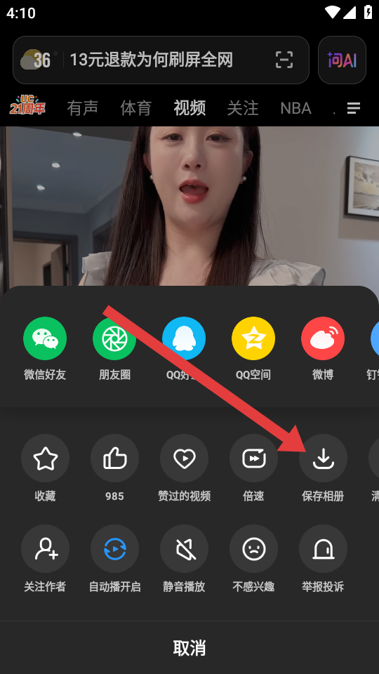 2、在视频播放的界面中,需要长按视频调出功能菜单并点击保存相册按钮,启动视频下载流程。