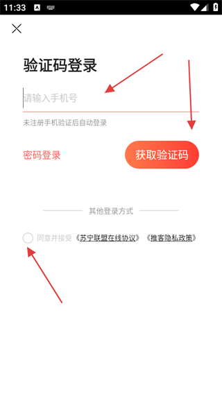 3、输入手机号,勾选同意并接受在线协议和隐私政策,点击获取验证码。