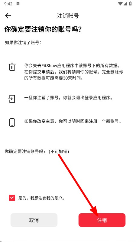 4、在注销账号提示页面,勾选同意注销的选项,然后点击注销。