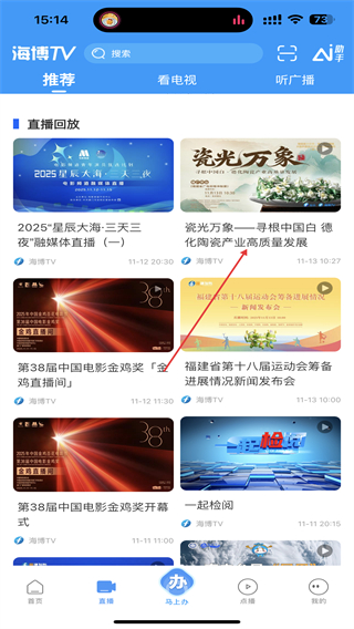 1、打开海博TV的APP,进入时点击导航栏中直播的图标。