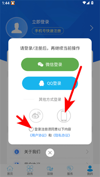 2、选择其他方式登录中的手机号登录,勾选登录注册须同意的《用户协议》和《隐私协议》。