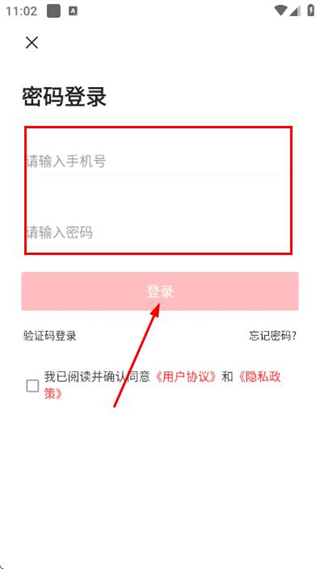 3、在密码登录页面填写手机号和密码,勾选协议后,点击登录完成账号登录操作。