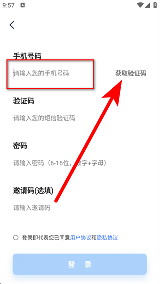 5、在输入框填入收到的验证码,设置密码后勾选协议,点击登录,完成注册。