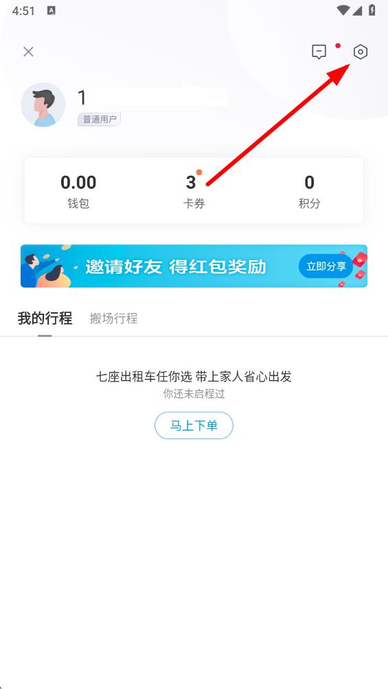 1、打开大众出行app,点击左上角的个人头像图标,进入个人页面。