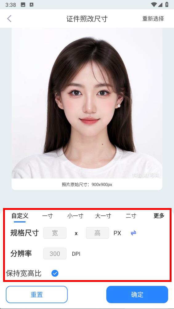 3、在证件照改尺寸页面,下方有预设的尺寸选项,也可以选择自定义,并设置规格尺寸、分辨率等参数。
