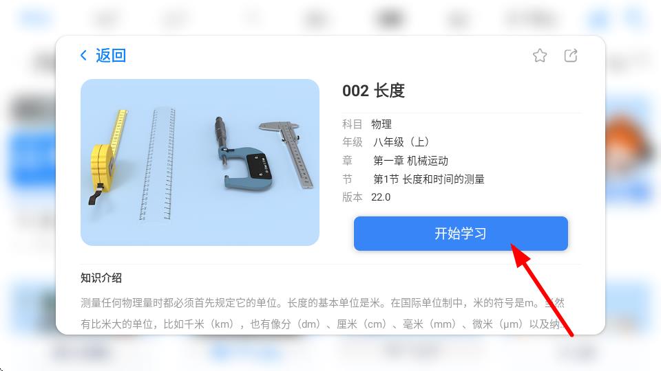 3、进入002长度详情页后,查看知识介绍,接着点击开始学习按钮。