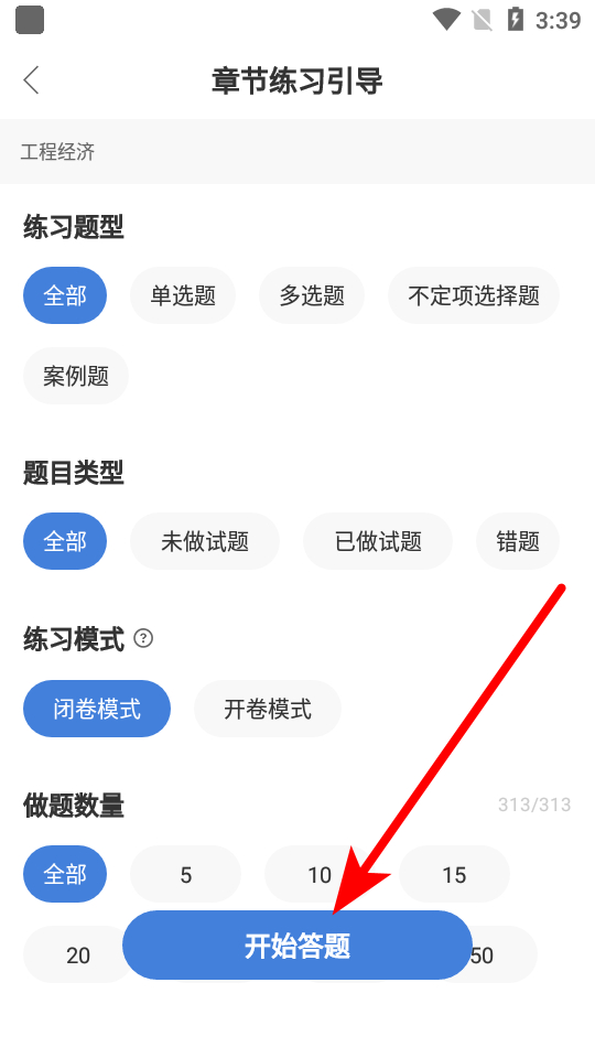 3、在页面设置练习题型、题目类型、练习模式和做题数量后,点击开始答题。