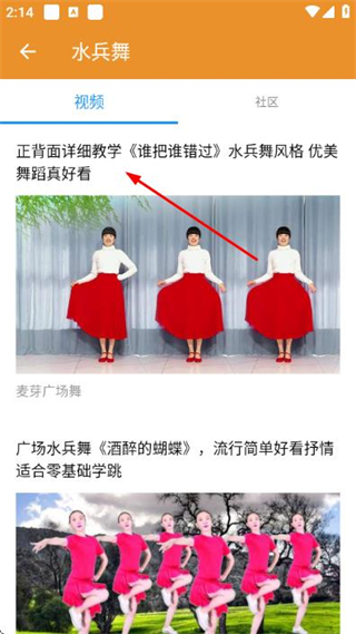 1、在首页广场舞分类板块点击目标舞蹈类型,进入内容页面。