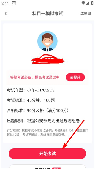 2、在考试页面,点击模拟考试下方的考试按钮,进入科目一模拟考试页面。