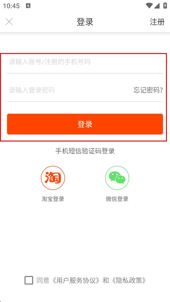 4、在登录界面,可输入账号和密码登录,也可选择手机短信验证码、淘宝或微信等方式登录,登录前需勾选同意相关协议。