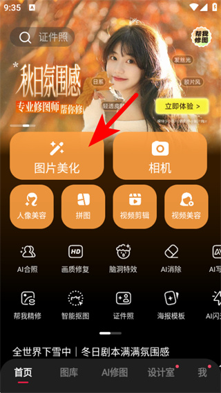 1、首先我们通过本站下载安装好软件后,点击进入软件,在软件的首页给大家提供了图片美化/人像美容/拼图/视频剪辑等多种功能,那么抠图放在另一个图片上,则是在图片美化功能中进行,我们点击【图片美化】进入;