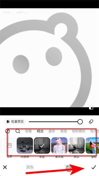 4、在滤镜选择界面,选择喜欢的滤镜效果后,点击右下角的对勾确认,即可为图片添加滤镜效果。