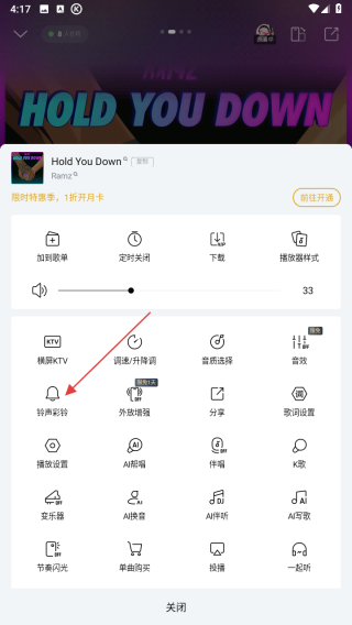 3、在弹出的菜单里,按红箭头指示点击铃声彩铃选项,然后根据提示操作即可将歌曲设置为来电铃声。