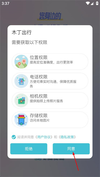 1、打开木丁出行后查看权限申请,勾选协议并点击同意按钮进入登录页。