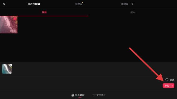 2、进入视频选择的界面内,选择后点击添加的按钮。