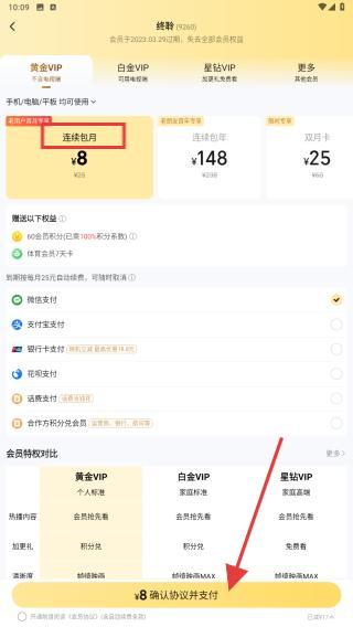 3、在会员套餐选择页面,找到连续包月的选项,再点击底部确认协议并支付的按钮即可。