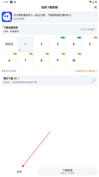4、在选择下载视频的页面内,点击下方全选的按钮即可。