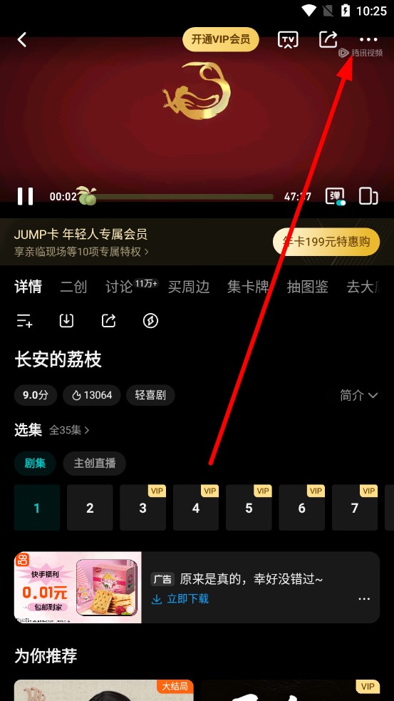 2、进入播放详情页后,在播放进度条上方的右侧区域,点击页面右上角⋯样式的更多功能按钮。
