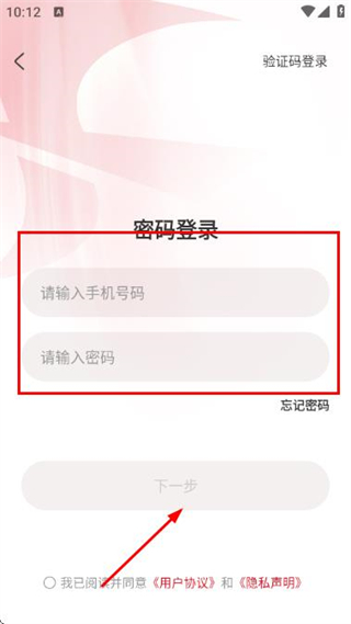 3、在密码登录页面填写手机号和密码,勾选协议后,点击下一步完成账号登录操作。
