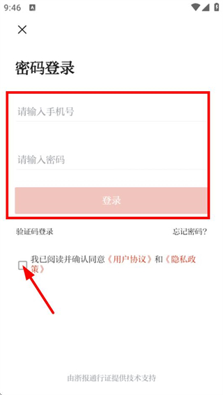 4、在密码登录页面,填写信息并勾选协议后,点击登录完成登录。