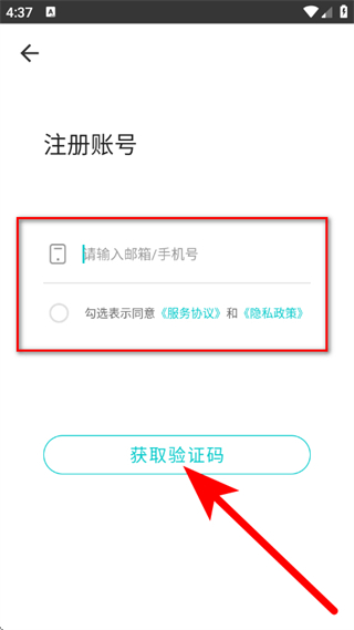 3、在注册账号页面,输入手机号,勾选协议后,点击获取验证码。