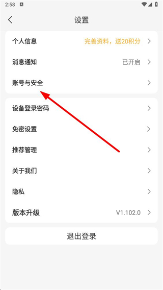 3、在设置界面点击账号与安全选项,进入账号安全页面。
