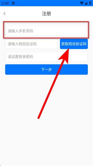 3、在注册页面,输入手机号,点击获取短信验证码。