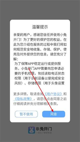 1、打开小兔开门,在弹出的提示页面,点击同意按钮。