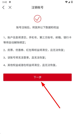 4、在注销账号页面,点击下一步,按照提示完成账号注销操作即可。