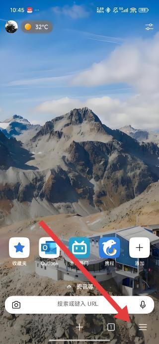 1、在浏览器界面中,点击底部右侧的菜单图标,打开包含收藏夹、历史记录等功能的选项界面,为后续操作做准备。