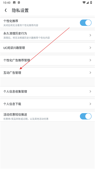 4、进入隐私设置页面之后,选择互动广告管理选项并点击。