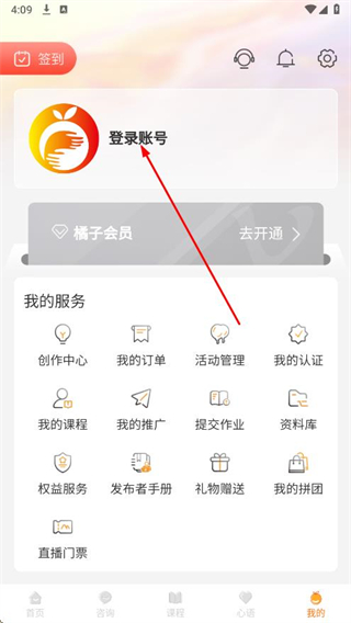 1、在橘子倾听App首页点击底部的咨询选项,进入我的咨询室页面。