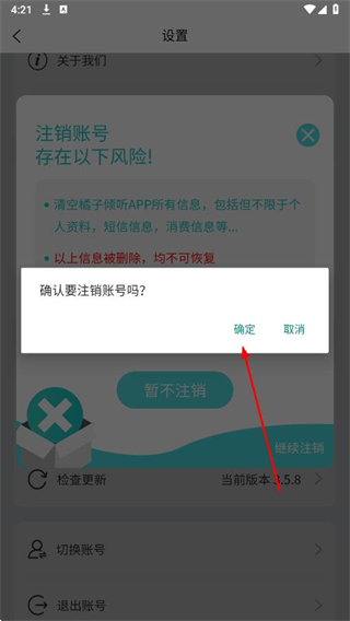 5、在新弹出的确认框中,点击确定,完成账号注销操作。