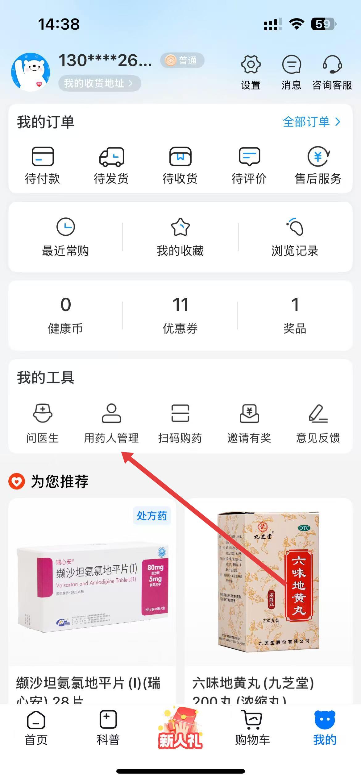 2、在我的页面里,找到我的工具板块,点击用药人管理。