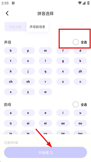 2、在拼音选择页面,点击全选后,点击开始练习,进入拼音练习页面。