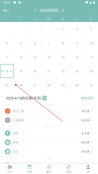 2、切换至记录页面,选择日期查看当天记录,如2025年8月18日,可录入日行一善、三省吾身等内容,完善健康运动日记,管理每日成长轨迹。