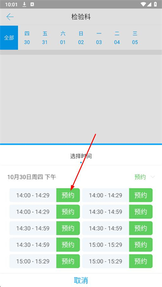 4、在检验科页面选择挂号日期,例如10月30日周四下午,点击预约。