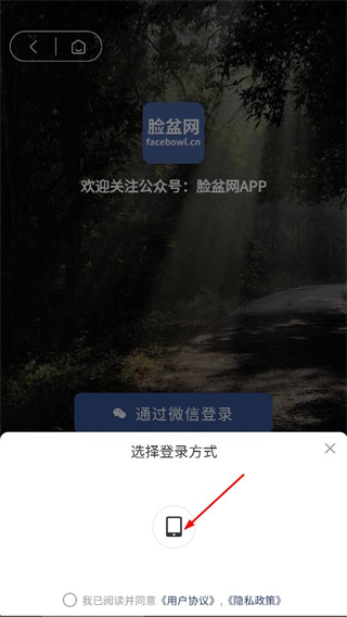 4、在登录方式选择弹窗中,点击手机图标,进入手机号登录页面。