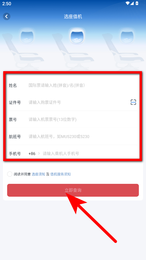 3、在选座值机页面,输入相关信息,勾选同意后,点击立即查询,完成值机选座操作。