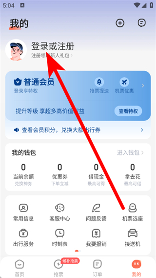 2、在个人中心页面,点击登录或注册,进入登录界面。