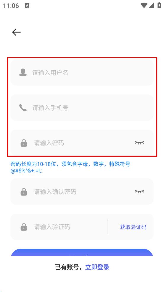 2、在注册页面,依次在对应输入框中输入用户名、手机号和密码。
