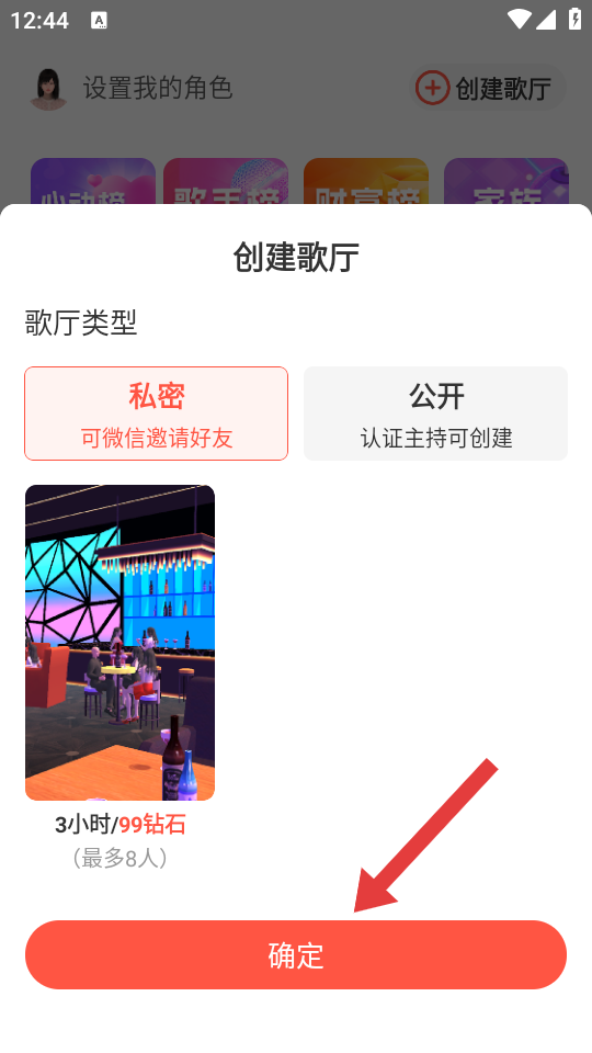 4、在创建歌厅界面,选择歌厅类型后,点击底部确定按钮,即可完成歌厅创建。