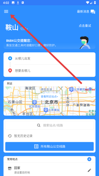 1、可以点击8684实时公交首页左上方按钮,展开侧边栏查看更多功能。