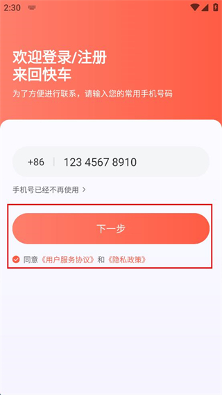 1、进入来回快车的登录注册页面,看到手机号输入框,准备填写常用手机号码。