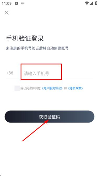 3、在手机验证登录页面填写手机号,勾选协议后,点击获取验证码。