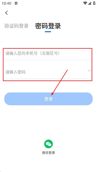 3、在密码登录页面,输入手机号和密码后,点击登录完成账号登录。