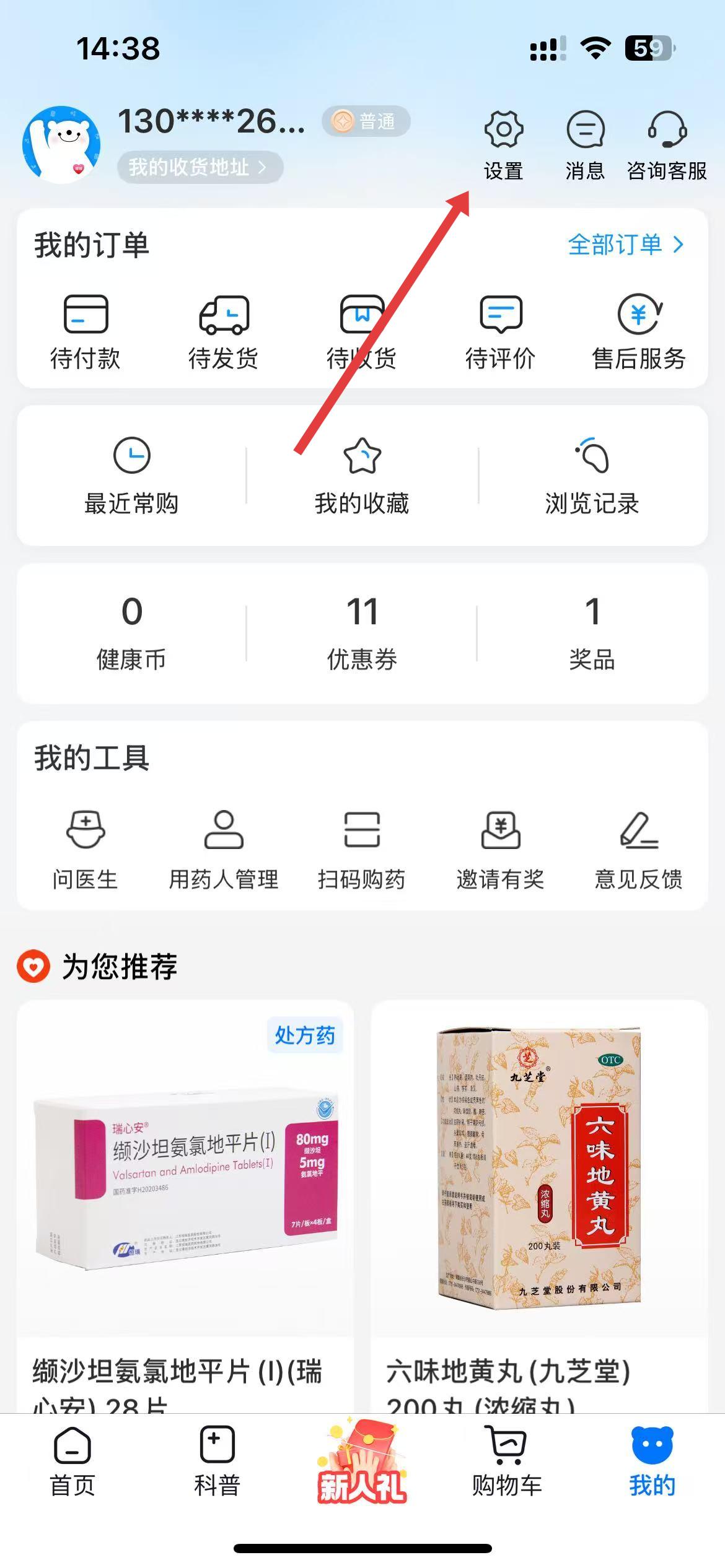 1、在方舟健客网上药店App首页点击底部的我的选项,进入个人中心页面。
