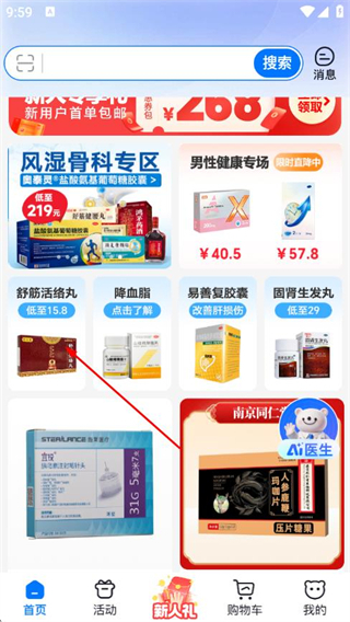 1、打开方舟健客网上药店APP,在首页选择想要购买的药品,点击进入药品详情页面。